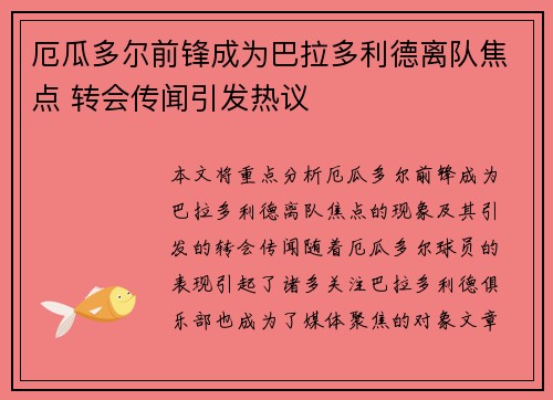 本文将从四个方面详细探讨国内球员如何通过展现卓越技术与团队协作获得广泛好评。这四个方面分别是:个人技术的突破与创新、团队配合的默契与高效、心理素质的成熟与稳定以及领导力与激励作用的发挥。随着国内足球水平的不断提升,越来越多的球员在赛场上展现出色的技术和团队精神,成为观众和媒体关注的焦点。本文将深入分析这些球员如何通过技术与协作,不仅在比赛中为球队带来胜利,也为中国足球带来了新的希望和活力。1、个人...